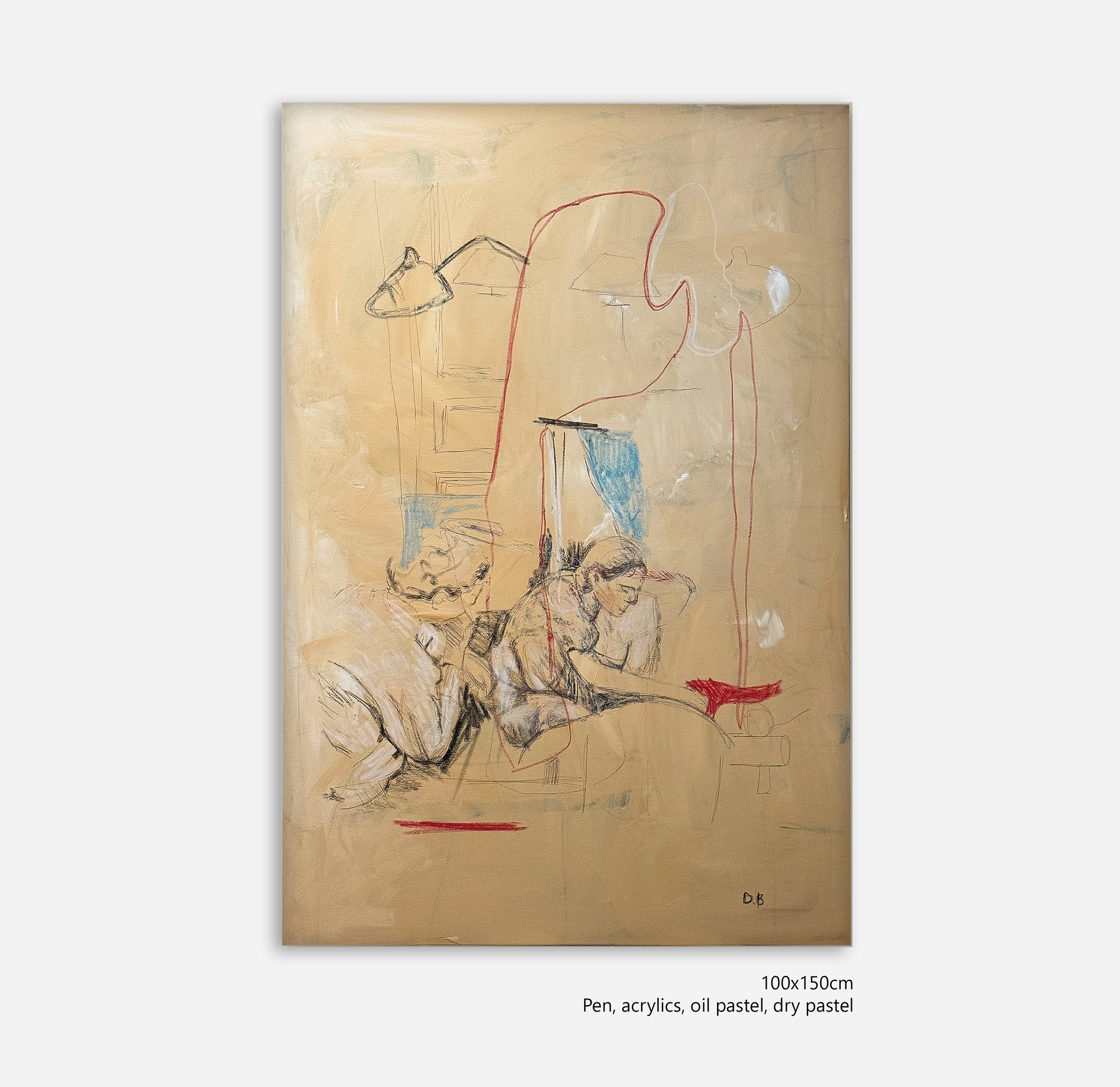 “After Talking” shows that strange quiet moment after a long conversation, when nothing more is being said, but you can still feel everything that was. The figures are stretched out, half–relaxed, half–tense, sharing the same space but each su savo mintimis. The loose lines and sketchy bodies feel like thoughts that haven’t fully formed yet, while the red marks hint at emotions that are still alive under the surface.