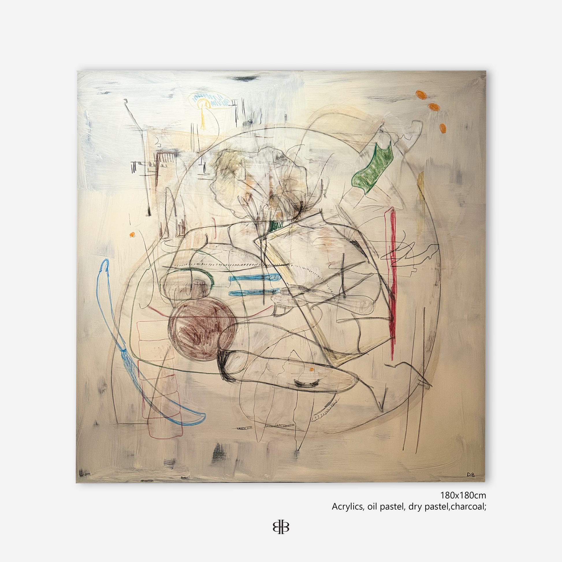 A contained field shaped like a basin, where lines and color behave like currents. Within the circle, a figure can briefly appear: a seated posture suggested by contours and interruptions, never fully declared. Accents and dots trace a trajectory that tests the boundary, letting motion spill outward while the structure stays calm.