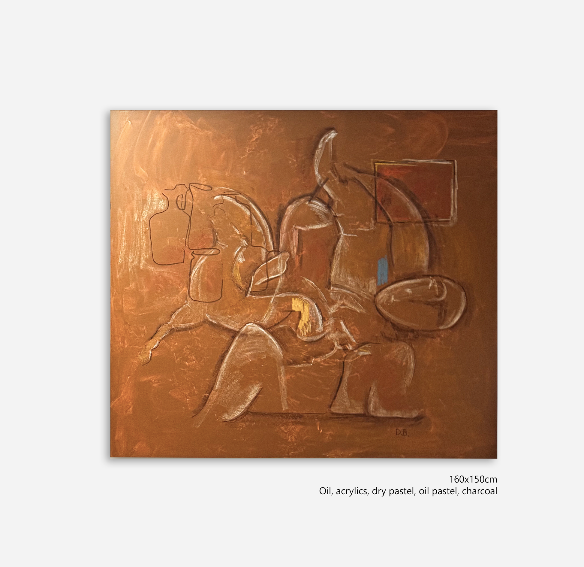 Each canvas is a body in flux – bent, dissolved, reassembled. Figures emerge from warm, tactile backgrounds, blending presence with absence, softness with strength. The works do not depict, they evoke – inviting the viewer to feel the tension between the visible and the intangible, between the physical weight of form and the fluidity of emotion.